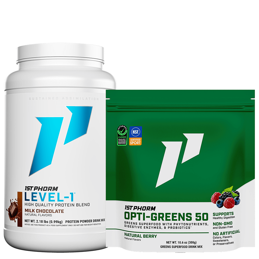 This stack is a combination of Level-1 Protein Powder and Opti-Greens 50 Superfood Greens Powder.